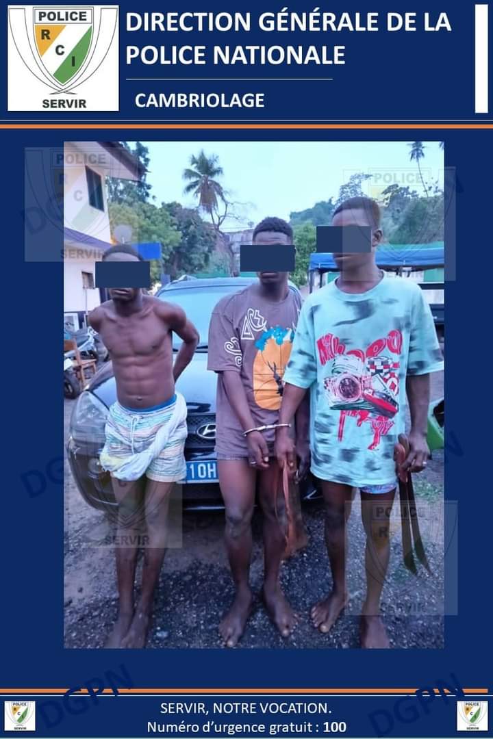 Le 15 mai 2023, une patrouille du District de Police d’Adjamé a surpris, dans les environs de l’église catholique Saint Michel d’Adjamé, trois (03) individus dont 02 étaient occupés à casser les cadenas d’un magasin afin de le cambrioler, tandis qu’un (01) autre attendait non loin à bord d’un véhicule de marque Hunday de type Tucson. À la vue des agents de police, ces quidams ont tenté de prendre la fuite. Une course poursuite s’est alors engagée et a permis leur l’interpellation.