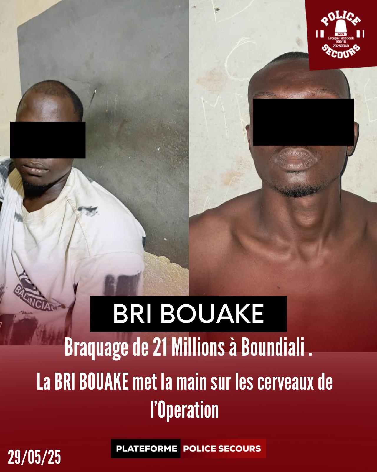 Deux membres présumés d’un gang impliqué dans un braquage de 21 millions de francs CFA à Boundiali ont été interpellés par la Brigade de Recherche et d’Intervention (BRI) de Bouaké, a-t-on appris de source sécuritaire.