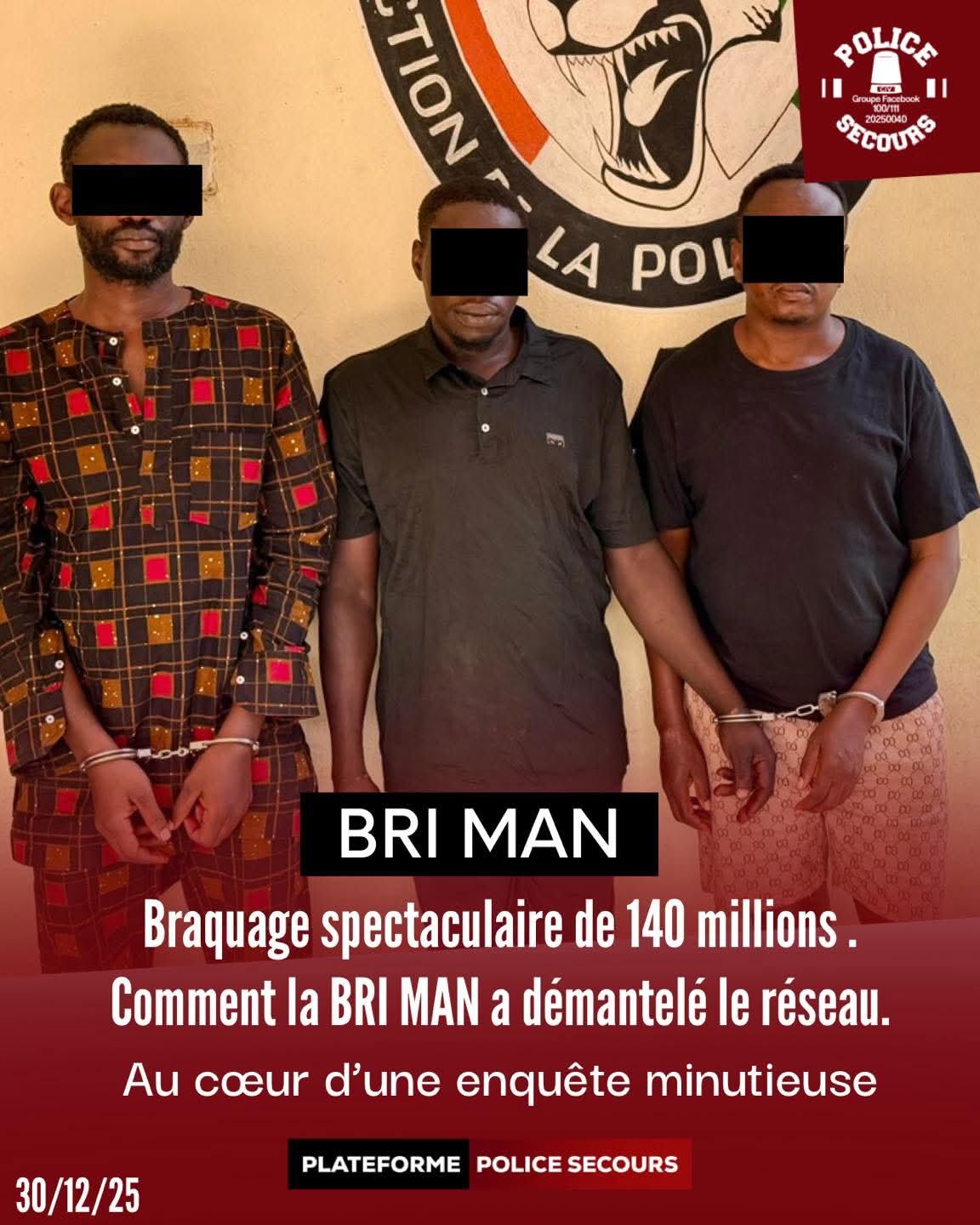 La Brigade de Recherche et d’Intervention (BRI) de Man a mis fin aux activités d’un réseau criminel impliqué dans le braquage de 140 millions de francs CFA au préjudice d’un gérant de magasin de café-cacao, a appris l’oeil d’Abidjan de sources sécuritaires.