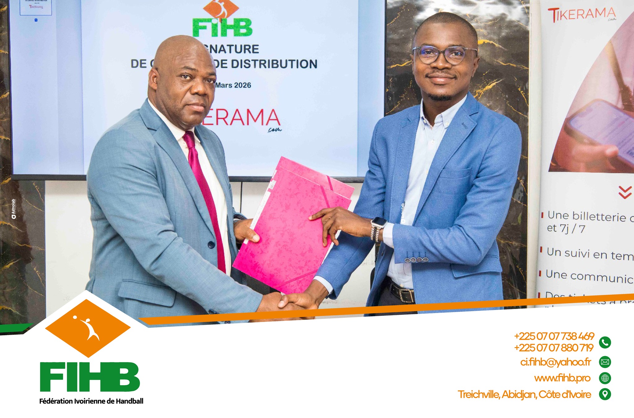 La cérémonie de signature s’est déroulée au siège de la Fédération, sous la présidence de Kamara Ibrahiman, président de la Fédération Ivoirienne de Handball, et en présence de Mohamed Fofana, manager de TIKERAMA.