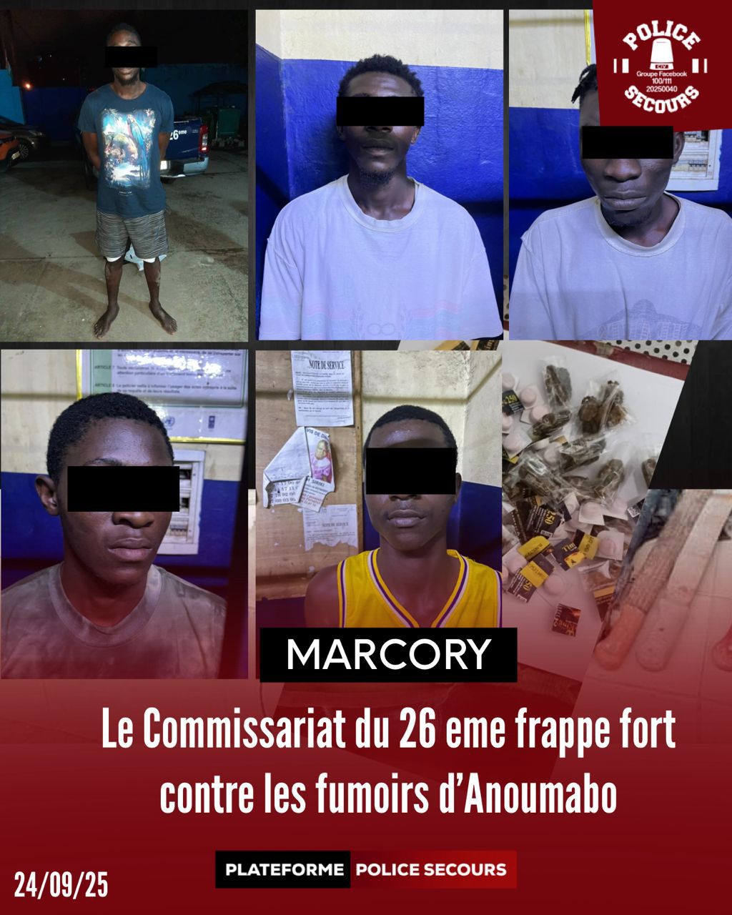 La nuit était encore épaisse quand les hommes du 26ᵉ arrondissement de police de Marcory ont lancé leur opération coup de poing. Dimanche 21 septembre 2025, à 17 heures, 17 agents ont quadrillé les ruelles d’Anoumabo et du secteur voisin de Sans-fil, bien décidés à faire tomber les fumoirs qui empoisonnent le quartier.