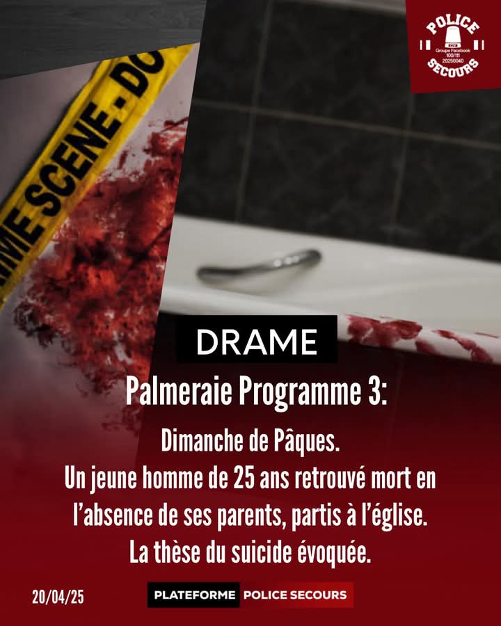 Ce dimanche 20 avril 2025, jour de la fête de Pâques, un drame s’est produit à la Riviera Palmeraie, dans le quartier Programme 3 / Rive gauche. Un jeune homme de 25 ans , a été retrouvé mort à son domicile.