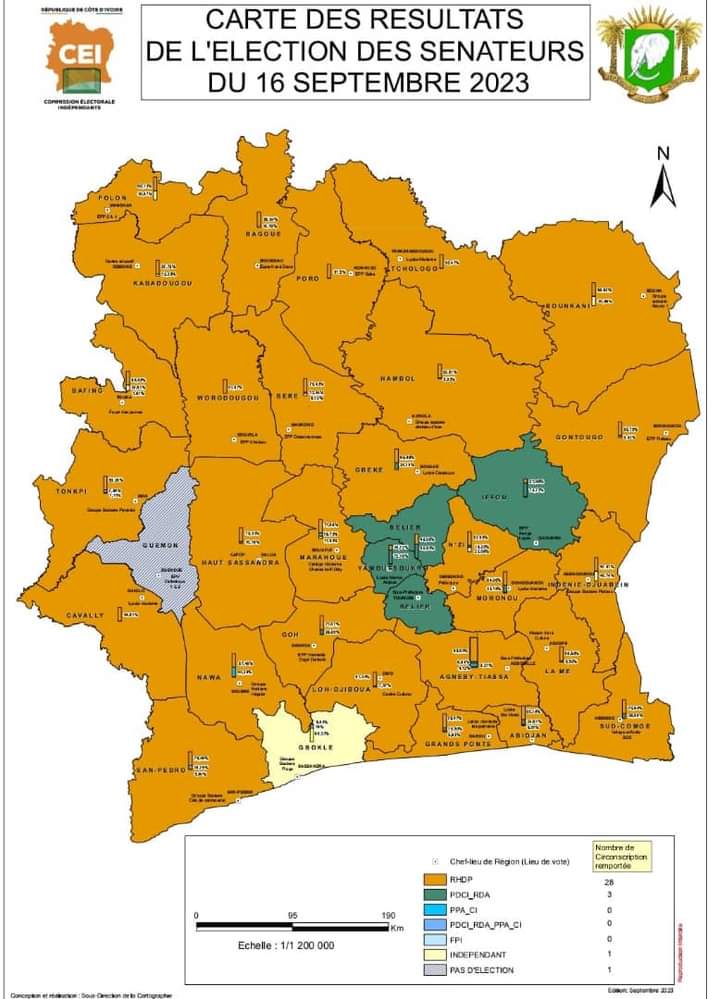 Sur les 64 sièges à pourvoir. Le Rhdp est arrivé en tête avec 56 sièges soit 87,50%, suivi du PDCI avec 6 sièges soit 09,38%. Les indépendants ferment la marche avec 2 sièges soit 3,13%